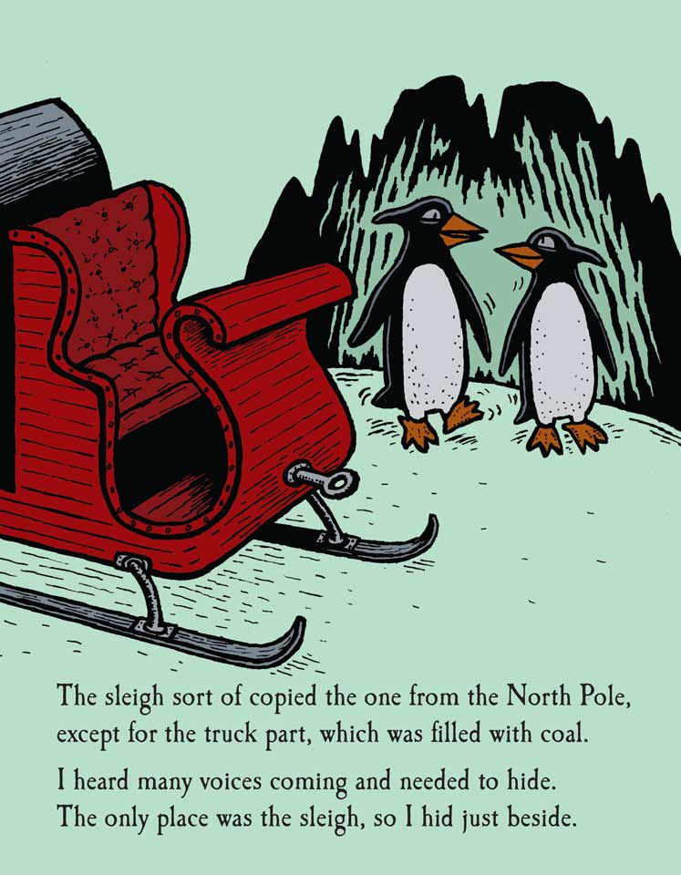 In The Cave of Santa Clops follow Mr. Odysseus Bones as he tells the neighborhood children about the time he encountered Santa Clops. Travel with him down memory lane, back to when he was but a young lad with his parents in Antarctica, as he openly defies his parents and ventures off alone to the South Pole. Ody gets stuck in a snow storm but is smart and capable and finds a cave to take shelter. It is in this shelter that he comes upon “giant walking, talking, dino-penguin birds!” As he eavesdrops on these tuxedoed, pterodactyl chicks he learns that if they eat the candy fish and repeat out loud the magic flying wish that they can fly! [Note: Buy Swedish fish to give along side this book.]