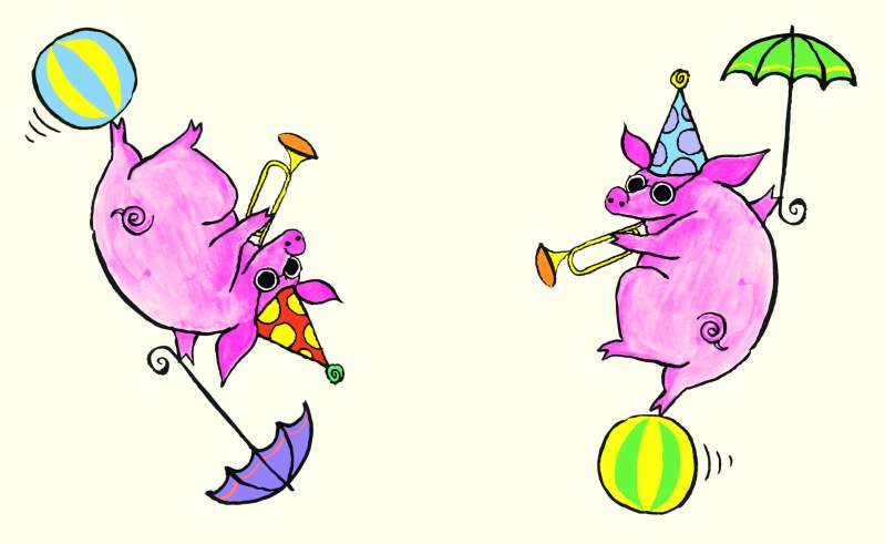 My fourteen-month old son’s favorite page is of the pigs balancing on the balls (you can see it below).  When I read this book to him one-on-one — once we get to the pig page — he’s done.  All he wants to do is look at this page and go no further.  I’d love to know what he’s thinking when he looks at this page.