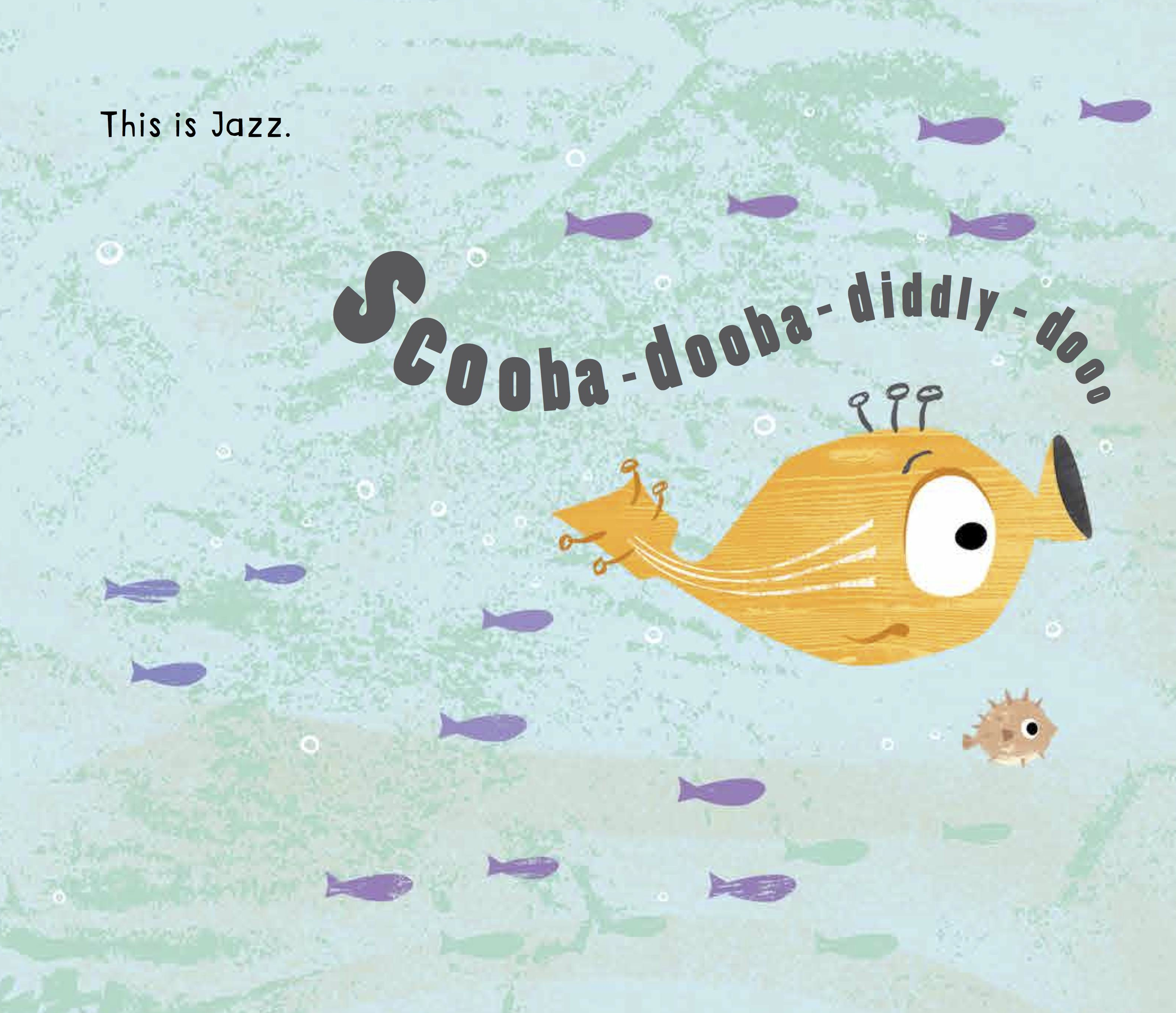 You might think, initially, that being swallowed by a whale is a bad thing. But it isn’t! Guess who is inside of the whale? Other wonderful bee-boppy sea creatures that just want to jam! Jazz has found his tribe and it is a musical and happy one!