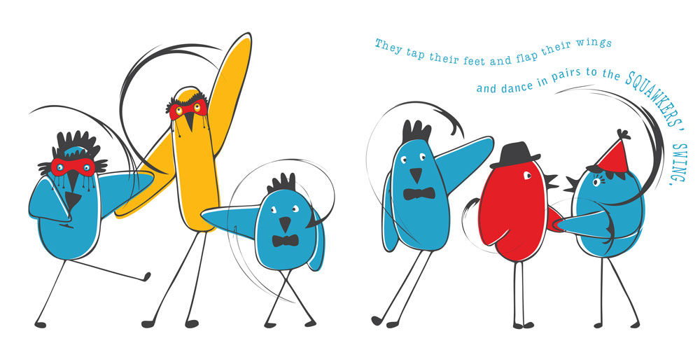 Summary: The squawking squawks are happy party birds that dance and swing and squeal and skip. They partying into the night and when they’re done most head home, but some stay and play along the telephone wires.
