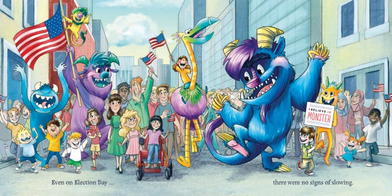 Monster’s attitude throughout the whole story is admirable. Can’t vote? No problem, just run for president. Can’t be president, yet? Doesn’t matter — the issue are what’s important, not the title. Monster’s resilient, positive, and energetic approach to obstacles is contagious — even for the most cynical among us.