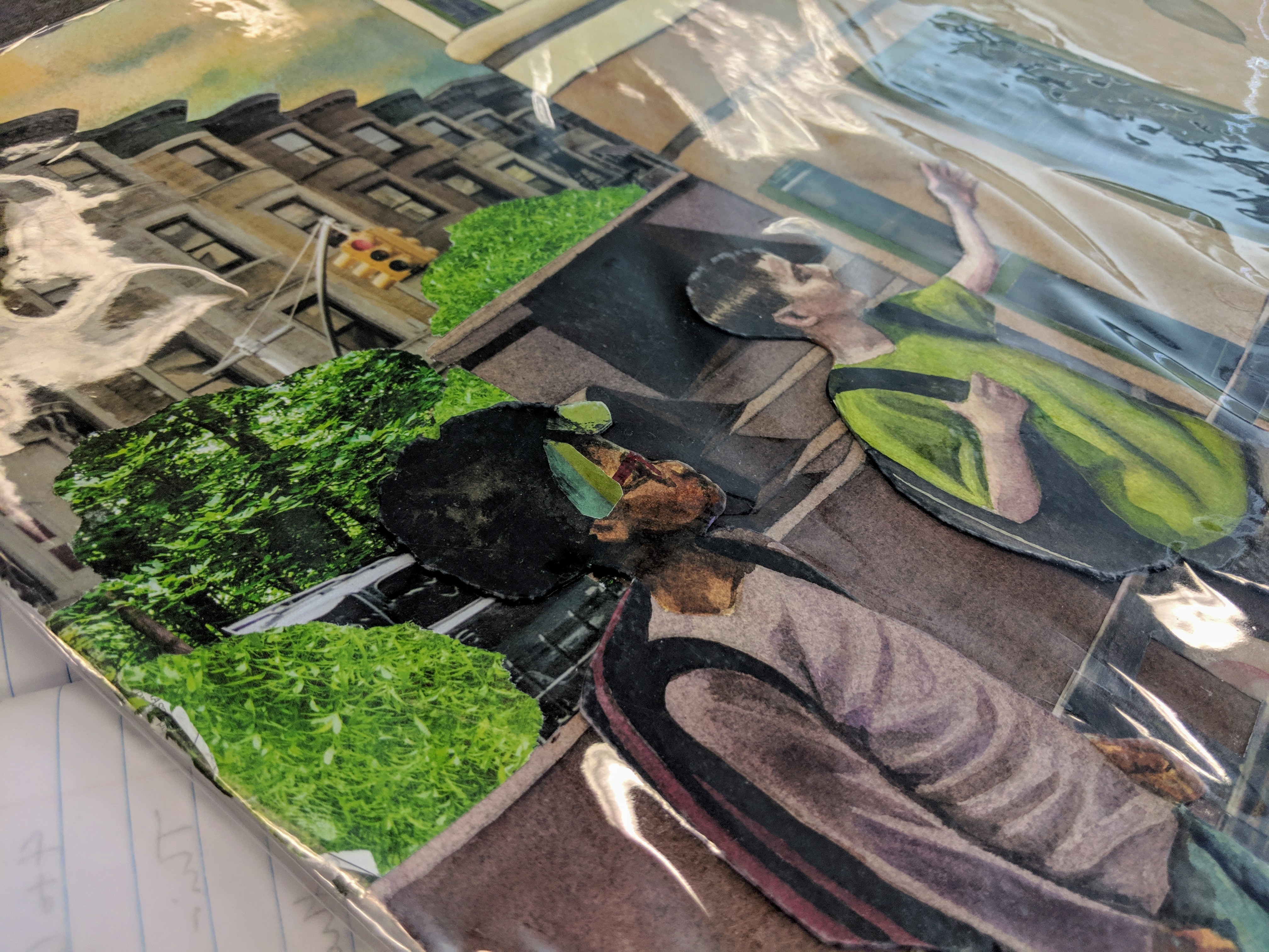 Bryan Collier is missing artwork – last seen 2016 – in a portfolio at Lenox Ave and 138th Street in New York, NY. It is watercolor and collage and though different than from what’s pictured above, it does give you an some general idea of what you’re looking for.