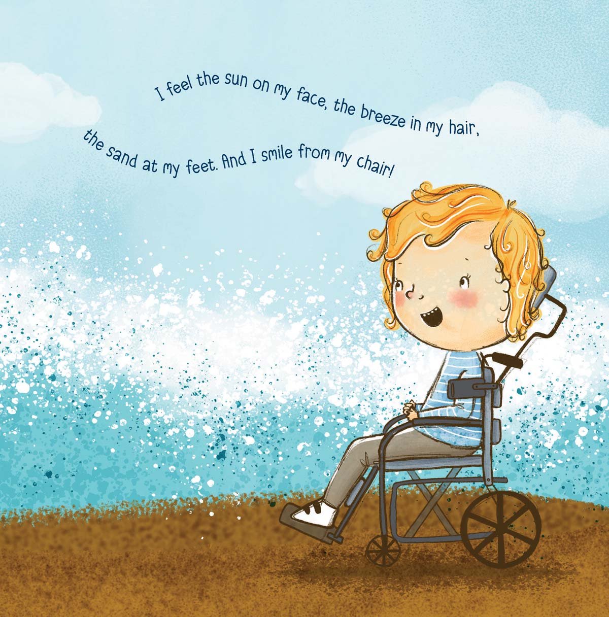 The illustrations are beautiful – they have an elegant playfulness to them and radiate the ebullience of a day at the beach. Each page is full of Ben or his family smiling – you can’t read this book without you and your children smiling, too. I enjoyed reading this book with my children. They asked lots of questions about what is CP, how does CP happen, and it gave me an opportunity to talk to them about how sometimes brains don’t form in the same way for everyone. They especially asked a lot of questions and were very curious about wheelchairs.