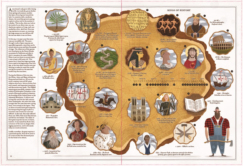 The wide-variety of topics include: What is a Tree? Leaves, Roots, The Four Seasons, Spreading Seeds, Endemic Species, Boababs, Tree Eaters, Tree Dwellers, Clever Camouflage, Prehistoric Trees, The Tallest Trees, The Broadest Trees (Árbol del Tule! 38 feet in diameter and about 1,500 years old – according to this book! Incredible!), The Oldest Trees (5,062 years old!), Rings of History (image above) – and I love how this book gives tidbits of history in relation to this 3,266 year-old tree. It gives you such a sense of perspective and a sense of how profound (heavy? staggering? difficult? I’m struggling with the right word here, but I think you understand) the loss of such old trees can be.